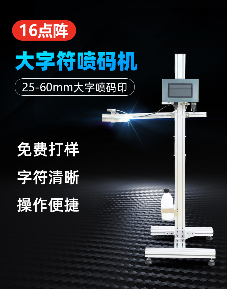 16點(diǎn)陣大字符噴碼機(jī),適用于建材、石材、化工包裝、水泥包裝等在線噴碼。有操作簡單,穩(wěn)定性強(qiáng),環(huán)境適應(yīng)能力強(qiáng)等特點(diǎn)。